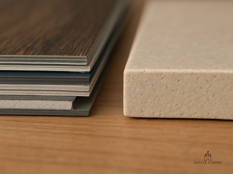 On the other side is classic tile, which mainly comes in two flavors: ceramic and porcelain. While they can look similar, the key difference is density. Think of standard ceramic as being like a terracotta pot—strong, but slightly porous. Porcelain is made from finer clay and baked hotter, making it dense and tough like a coffee mug. This extra toughness and superior water resistance are why porcelain has become the standard for most floors, especially in kitchens and bathrooms.